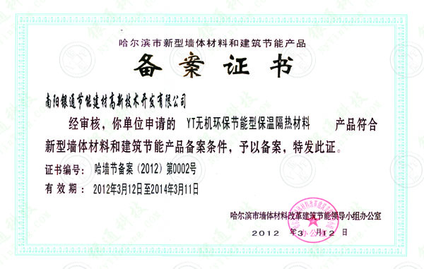 經(jīng)審核,你單位申請的YT無機(jī)環(huán)保節(jié)能型保溫隔熱材料產(chǎn)品符合新型墻體材料和建筑節(jié)能產(chǎn)品備案條件,予以備案,特發(fā)此證。