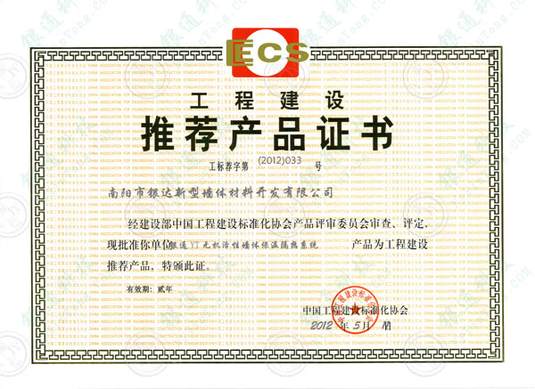 工程建設(shè)推薦產(chǎn)品證書(shū) 工標(biāo)薦第(2012)032號(hào) 南陽(yáng)銀通節(jié)能建材高新技術(shù)開(kāi)發(fā)有限公司 經(jīng)建設(shè)部中國(guó)工程建設(shè)標(biāo)準(zhǔn)化協(xié)會(huì)產(chǎn)品評(píng)審委員會(huì)審查、評(píng)定,現(xiàn)批準(zhǔn)你單位銀通YT無(wú)機(jī)活性墻體保溫隔熱系統(tǒng)產(chǎn)品為工程建設(shè)推薦產(chǎn)品,特頒此證。有效期:貳年 中國(guó)工程建設(shè)標(biāo)準(zhǔn)化協(xié)會(huì) 2012年5月11日