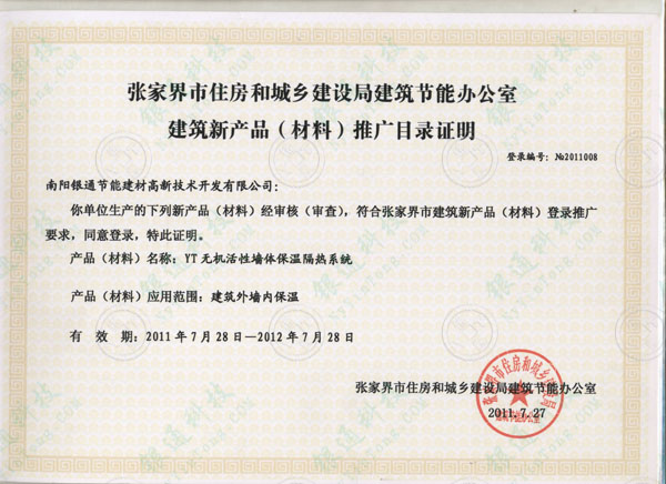張家界市住房和城鄉(xiāng)建設局建筑節(jié)能辦公室建筑新產品(材料)推廣目錄證明 登錄編號:No.2011008 南陽銀通節(jié)能建材高新技術開發(fā)有限公司:你單位生產的下列新產品(材料)經審核(審查),符合張家界市建筑新產品(材料)登錄推廣要求,同意登錄,特此證 明。 產品(材料)名稱:YT無機活性墻體保溫隔熱系統(tǒng) 產品(材料)應用范圍:建筑外墻內保溫 有效期:2011年7月28日——2012年7月28日 張家界市住房和城鄉(xiāng)建設局節(jié)能辦公室 2011.7.27