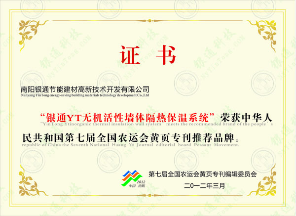 證書 南陽銀通節能建材高新技術開發有限公司 “銀通YT無機活性墻體隔熱保溫系統”榮獲中華人民共和國第七屆全國農運會黃頁?扑]品牌。 第七屆全國農運會黃頁專刊編輯委員會 二零一二年三月
