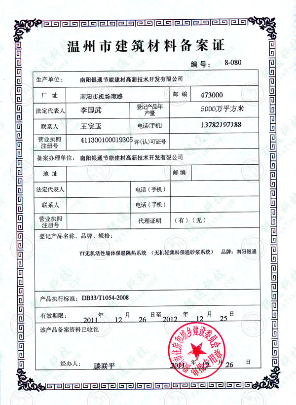 溫州市建筑材料備案證 編號:8-080 生產單位:南陽銀通節能建材高新技術開發有限公司 登記產品名稱、品牌、規格:YT無機活性墻體保溫隔熱系統(無機輕集料保溫砂漿系統) 品牌:南陽銀通 產品執行標準:DB33/T1054-2008 有效期:2011年12月26日至2012年12月25日 該產品備案資料已收訖 溫州市住房和城鄉建設委員會 審批專用章 2011年12月26日