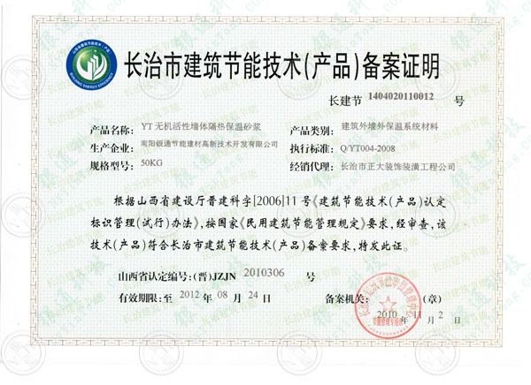 山西長(zhǎng)治市建筑節(jié)能技術(shù)產(chǎn)品備案證明 長(zhǎng)建節(jié) 1404020110012號(hào) 產(chǎn)品名稱yt無(wú)機(jī)活性墻體隔熱保溫砂漿 產(chǎn)品類型 建筑外墻外保溫系統(tǒng)材料 生產(chǎn)企業(yè) 南陽(yáng)銀通節(jié)能建材高薪技術(shù)開(kāi)發(fā)有限公司 執(zhí)行標(biāo)準(zhǔn) Q/YT2004-2008規(guī)格型號(hào) 50KG 根據(jù)山西省建設(shè)廳晉建科字【2006】11號(hào)建筑節(jié)能技術(shù)產(chǎn)品認(rèn)定標(biāo)識(shí)管理試行方法,按國(guó)家民用建筑節(jié)能管理規(guī)定要求,經(jīng)審查 該技術(shù)產(chǎn)品符合長(zhǎng)治市建筑節(jié)能技術(shù)產(chǎn)品備案要求 特發(fā)此證 山西省認(rèn)定編號(hào) 晉JZJN2010306號(hào) 有效期限至2012年08月24日 備案機(jī)關(guān) 長(zhǎng)治市建筑節(jié)能產(chǎn)品管理中心