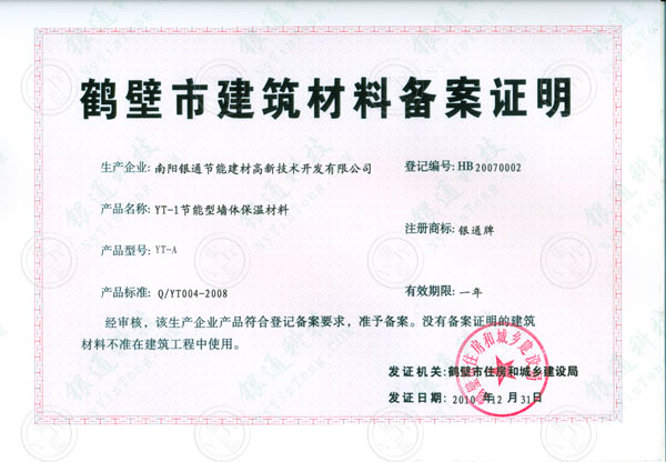 河南省鶴壁市建筑材料備案證明 備案編號(hào)HB20070002 企業(yè)名稱南陽銀通節(jié)能建材高新技術(shù)開發(fā)有限公司 產(chǎn)品名稱YT-1節(jié)能型墻體保溫材料 規(guī)格型號(hào)YT-A 注冊(cè)商標(biāo)銀通牌 產(chǎn)品標(biāo)準(zhǔn)Q/YT004-2008 有效期限一年 經(jīng)審核,該生產(chǎn)企業(yè)產(chǎn)品符合登記備案要求 準(zhǔn)予備案沒有備案證明的建筑材料不準(zhǔn)在建筑工程中使用 發(fā)證機(jī)關(guān)鶴壁市住房和城鄉(xiāng)建設(shè)廳 發(fā)證日期2010年12月31日