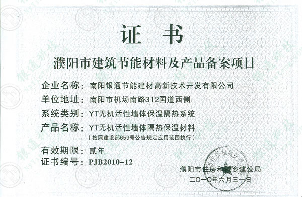 河南省濮陽市建筑節能材料及產品備案證書 企業名稱 南陽市銀達新型墻體材料開發有限公司 單位地址 南陽市機場南路312國道西側 產品名稱YT無機活性墻體保溫隔熱系統 系統類別無機活性墻體保溫隔熱系統 證書編號PJB2010-12 有效期限二年 規格型號YT-A 產品型號50kg/袋 注冊商標銀通 銀達 登記備案機關 濮陽市住房和城鄉建設局 發證日期2010年6月30日