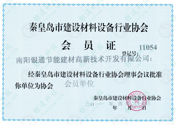 河北省秦皇島市建設(shè)材料設(shè)備行業(yè)協(xié)會(huì)會(huì)員證 登記號(hào)11054 南陽(yáng)銀通節(jié)能建材高新技術(shù)開(kāi)發(fā)有限公司 經(jīng)秦皇島市建設(shè)材料設(shè)備行業(yè)協(xié)會(huì)理事會(huì)會(huì)議批準(zhǔn)你單位為協(xié)會(huì)會(huì)員單位秦皇島市建設(shè)材料設(shè)備行業(yè)協(xié)會(huì) 2011年4月