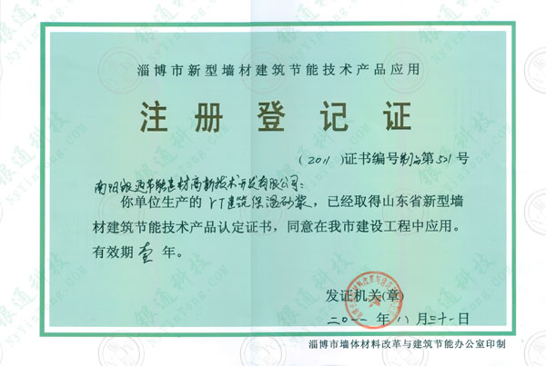山東淄博市新型墻體建筑節(jié)能技術(shù)產(chǎn)品應(yīng)用注冊(cè)登記證2011證書編號(hào)第521號(hào) 南陽銀通節(jié)能建材高新技術(shù)開發(fā)有限公司 你單位生產(chǎn)的yt建筑保溫砂漿 已經(jīng)取得山東省新型墻材建筑節(jié)能技術(shù)產(chǎn)品認(rèn)定證書 同意在我市建設(shè)工程中應(yīng)用 有效期壹年 發(fā)證機(jī)關(guān) 淄博市墻體材料改革與建筑節(jié)能辦公室 二零零一八月三十一日