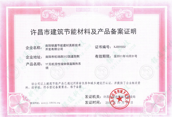 河南省許昌市建筑節(jié)能材料及產(chǎn)品備案證書 企業(yè)名稱 南陽市銀達(dá)新型墻體材料開發(fā)有限公司 單位地址 南陽市機(jī)場南路312國道西側(cè) 產(chǎn)品名稱YT無機(jī)活性墻體保溫隔熱系統(tǒng) 系統(tǒng)類別無機(jī)活性墻體保溫隔熱系統(tǒng) 證書編號(hào)XJ201032 有效期限至2011年10月31日 注冊商標(biāo)銀通 銀達(dá) 該公司以上建筑節(jié)能產(chǎn)品已通過河南省建設(shè)廳認(rèn)證 并提供了企業(yè)相關(guān)資料 同意備案 發(fā)證機(jī)關(guān) 許昌市住房和城鄉(xiāng)建設(shè)局 發(fā)證日期2010年10月25日