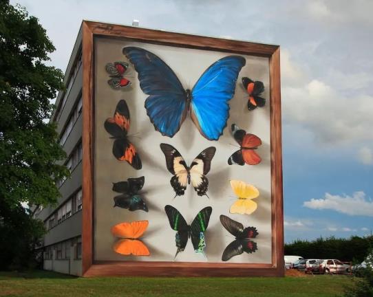 透過(guò)在世界各地建筑外墻上繪制大型蝴蝶標(biāo)本,由此來(lái)提醒大眾,近幾十年來(lái)蝴蝶數(shù)量持續(xù)減少中,這是我們?nèi)祟?lèi)不得不重視的問(wèn)題。